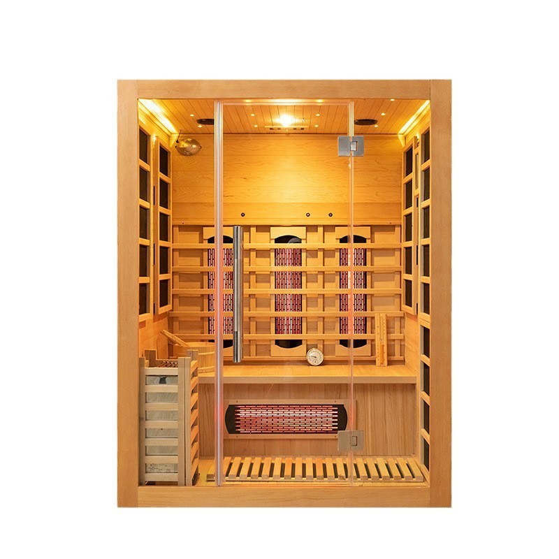 Sala de saună cu infraroșu și abur din lemn pentru 1-3 persoane este plină de funcții avansate pentru a vă îmbunătăți călătoria de wellness: încălzitoare cu infraroșu și plăci de încălzire cu grafen cu infraroșu îndepărtat (oferă încălzire uniformă și eficientă pentru o transpirație profundă și relaxantă); Oxygen Ionizer (purifică aerul din interiorul saunei, creând o atmosferă proaspătă și revigorantă); Reading Light & Speaker (vă permite să citiți sau să ascultați muzică în timp ce vă bucurați de sesiunea de saună); Panou de control (permite ajustarea ușoară a temperaturii, timpului și a altor setări pentru o experiență personalizată); Sauna Sobe & Light Wave Tube (lucrează împreună pentru a genera abur și căldură în infraroșu, găzduind atât iubitorii de saune cu abur, cât și cu infraroșu îndepărtat).