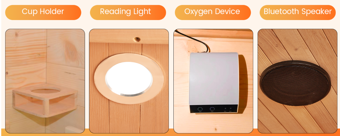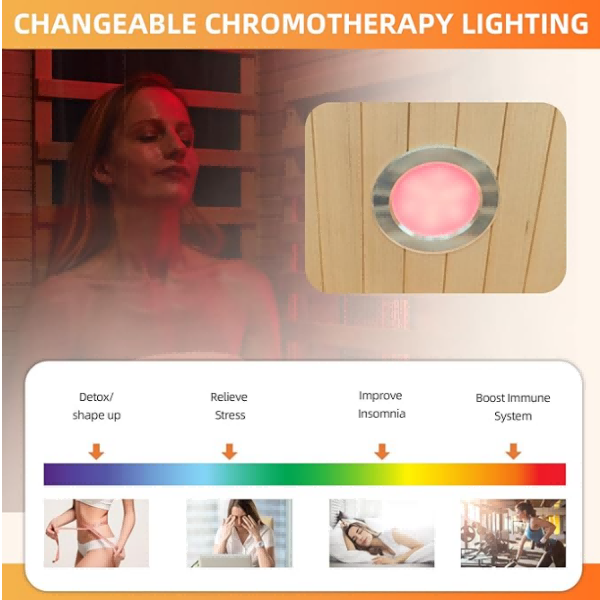 【Relaxare îmbunătățită】 Saunele noastre cu infraroșu pentru casă prezintă un acoperiș iluminat cu terapie cu 7 culori, creând o atmosferă imersivă pentru a vă îmbunătăți experiența generală. Este ușor instalabil în subsol, baie sau sală de gimnastică, iar cu conectivitate Bluetooth și o bară de oxigen, vă puteți bucura de o sesiune de saună relaxantă