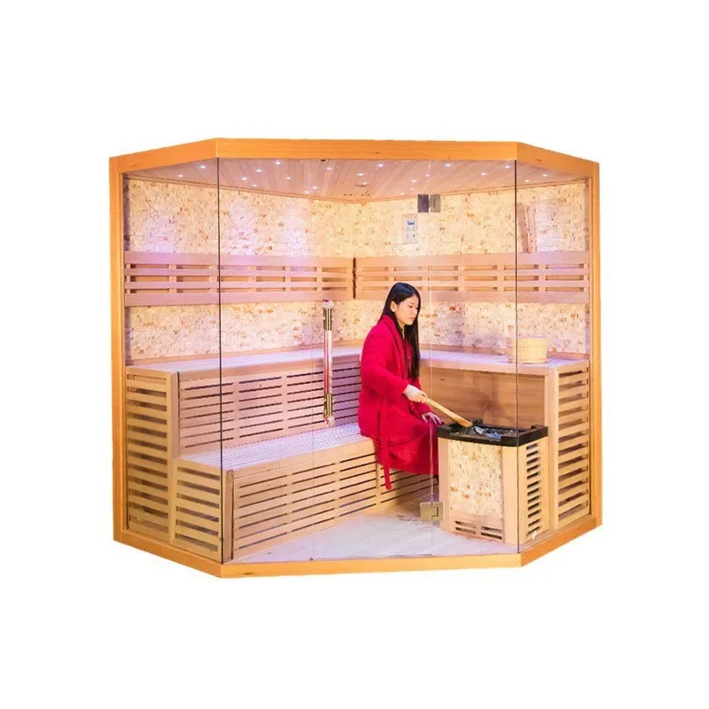 Această saună cu Hemlock cu Sistem de control inteligent din sticlă pe 3 fețe integrează materiale premium, design transparent, control inteligent și garanții de siguranță, cu măiestrie meticuloasă, de la componentele de bază până la accesorii detaliate. Fie că este folosit ca spațiu privat de relaxare acasă pentru experiențe profesionale de saună în timpul programelor încărcate, sau în setari comerciale, cum ar fi hoteluri, cluburi SPA și centre de fitness pentru a oferi servicii de înaltă calitate, acesta răspunde perfect nevoilor diverse - creând o experiență de saună confortabilă, sănătoasă și profesională pentru tine.
