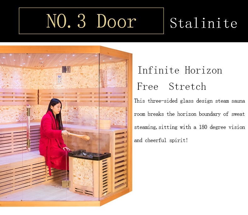 Prezentând în mod inovator o structură de ușă din sticlă specială Stalinită cu trei fețe, această sticlă suferă un tratament special de temperare la temperatură înaltă, oferind o rezistență remarcabilă la căldură și rezistență la impact. Menține stabilitatea chiar și la temperaturi care depășesc 70℃ în interiorul saunei, cu o transparență ultra-înaltă și fără distorsiuni optice. Designul din sticlă cu trei laturi realizează o vedere largă de 180 de grade, fără obstacole, rupând complet senzația de înghesuite și închisă a saunelor tradiționale. Utilizatorii pot menține contactul vizual cu mediul extern în timp ce se bucură de saună, făcând-o ideală pentru balcoanele casei, curți și alte scenarii - permițându-vă să apreciați peisajul în aer liber în timp ce experimentați terapia termică pentru o minte și un corp mai relaxați și confortabil. În plus, sistemul de ambianță Starlight integrat în interior creează un efect de stea sclipitoare prin benzi de lumină LED ascunse pe pereții de sus și laterali. Lumina moale completează aburul cald, ameliorând eficient oboseala ochilor și creând o atmosferă de saună captivantă și plăcută.