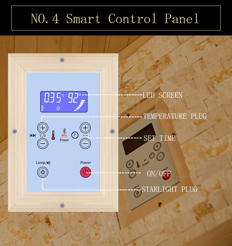 - Senzor de temperatură: încorporat în peretele lateral al saunei pentru a capta cu precizie schimbările de temperatură din diferite zone, asigurând o încălzire uniformă.