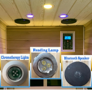 *Inclus: Conexiuni pentru încălzirea interioară cu capac din lemn, mâner ușii (2 șuruburi), picioare de saună detașabile și reglabile pentru suprafețe neuniforme, panouri de încălzire pentru saună cu infraroșu, plafoniere Spectrum LED lângă infraroșu combinate cu terapie cu lumină roșie Spectrum de calitate medicală, controler 2.0, construit -panou de control LCD cu ecran tactil cu sunet Bluetooth, upgrade audio cu difuzoare HiFi de 6 inchi, sticla securizata de 8 mm pentru retenția termică finală.