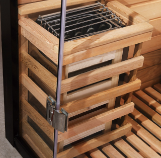 - Interior din lemn de cedru natural: interiorul este căptușit cu lemn de cedru premium, care eliberează o aromă subtilă, calmantă atunci când este încălzit. Cedru se mândrește, de asemenea, cu o reținere excelentă a căldurii, menținând spațiul cald în mod eficient și rezistă la umezeală pentru a evita deformarea.
